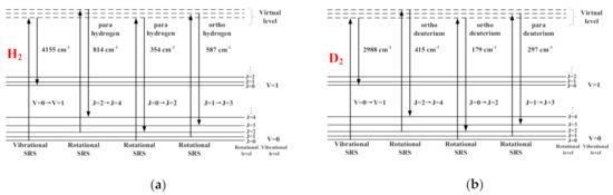 The schematic diagram of the energy-level transitions of (a) H2 [57] and (b) D2 [58] SRS.