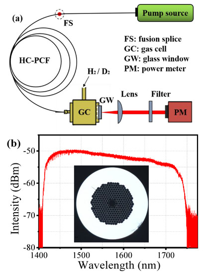 Figure 6a presents the typical experimental setup of 1.7 μm FGRLs, comprising mainly a pump source, HC-PCFs, a gas cell, and a set of lenses. The pump laser is a 1.5 μm pulsed erbium-doped fiber amplifier (EDFA), the pigtail fiber (Corning, SMF-28e) of which is fusion-spliced with the HC-PCFs (NKT Photonics, HC-1550-02) due to a similar mode field area and numerical aperture, and the theoretical minimum loss can be as low as 1.3 dB [59]. The output end of the HC-PCFs is sealed in a gas cell with a glass window, and the HC-PCFs can be filled with a gas medium through the gas cell. The output lasers being transmitted through the glass window are collimated and are filtered by a set of lenses.