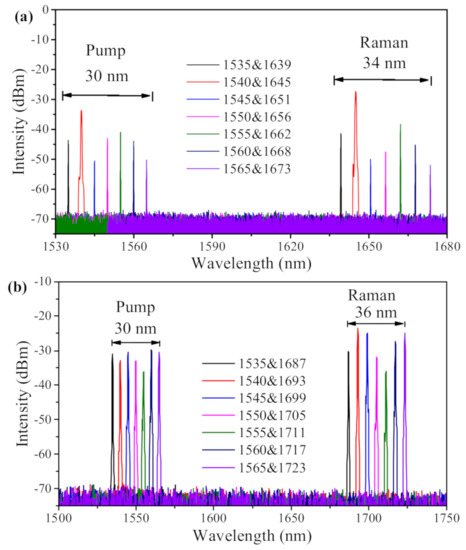 A pulsed fiber amplifier with a wavelength tuning range of 1535–1565 nm was used to pump 20-m-long HC-PCFs filled with D2 or H2, and the output spectra are shown in Figure 7a [27] and Figure 7b [28], respectively. It can be seen that one pump line in the 1.5 um band is converted into one Raman line in the 1.7 μm band (415 and 587 cm−1 Raman frequency shift coefficients of D2 and H2, respectively), which greatly improves the power conversion efficiency. This is not difficult to explain. Take D2 SRS as an example; if the pump wavelength is 1550 nm, because the 2886 nm Raman line generated by vibrational SRS (with a Raman frequency shift of 2987 cm−1) is located outside the low-loss transmission band, it is strongly suppressed. Moreover, because the Raman gain of the 1656 nm rotational Raman line (with a Raman frequency shift of 415 cm−1) is higher than that of 1625 and 1594 nm rotational Raman lines (with Raman frequency shifts of 297 and 179 cm−1, respectively), the 1550 nm pump line will first be converted into a 1656 nm Raman line, and the residual pump power is too low to generate 1625 and 1594 nm Raman lines. The explanation of the output spectrum of H2 SRS is also similar. Therefore, the output Raman wavelengths are determined by the gas media, pump wavelength, and fiber attenuation.