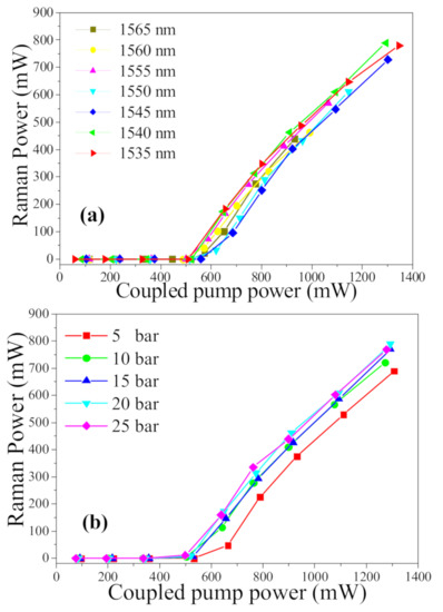 Figure 8a shows the output Raman power as a function of coupled average pump power at different pump wavelengths when the fiber length is 20 m [27]. The maximum Raman power decreases toward the long wavelength. It can be attributed to the amplification performance of the pump source. The output power of the pump source is slightly reduced as the wavelength increases. In fact, when the fiber attenuation in the pump band and output Raman band is basically unchanged, the wavelength change has little effect on the output Raman power. Figure 8b shows the output Raman power as a function of coupled average pump power at different gas pressures when the fiber length is 20 m [27]. Since the molecular density of the gain gas in the HC-PCFs can be adjusted by the barometer of the gas cell, this provides new freedom in the optimization of the 1.7 μm FGRL performance for high-power laser emission. When the gas pressure is too low, the Raman threshold is relatively higher due to the small Raman gain [60], thereby affecting the output Raman power. While the Raman gain is saturated at a high gas pressure level, the contribution of increasing gas pressure to the Raman gain becomes extremely small. Therefore, it can be seen from Figure 7b that when the gas pressure is higher than 15 bar, the Raman power does not increase obviously.