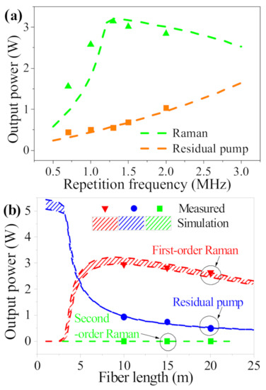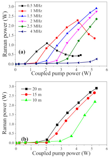 Figure 9 presents the experimental results of using a higher-power pump source [29], and cascaded Raman conversion is more likely to occur under high pump power. Figure 9a presents the output Raman power as a function of the coupled average pump power at different repetition frequencies of the pump pulse when the fiber length is 20 m and the gas pressure is 16 bar. It can be seen that the repetition frequency has a great influence on the output Raman power, and there is an optimal repetition frequency to achieve the maximum output Raman power. This is because when the fiber length and the gas pressure are constant, the Raman threshold of the pump peak power is also constant. Thus, it is necessary to adjust the repetition frequency to obtain a suitable peak power so that the peak power is much higher than the first-order Raman threshold but does not exceed the second-order Raman threshold. When the peak power is much higher than the first-order Raman threshold, more pump pulse energy can undergo Raman conversion. When the peak power does not exceed the second-order Raman threshold, the first-order to second-order cascaded Raman conversion will not occur, which means that the first-order Raman power will not fall at the high pump power level. Figure 8b presents the output Raman power as a function of the coupled average pump power at different fiber lengths when the repetition is 1.5 MHz and the gas pressure is 16 bar. It can be seen that the Raman threshold increases with a decrease in the fiber length, which means that less pump pulse energy is converted into Raman pulse energy, so the maximum output Raman power also decreases. Therefore, when the fiber length is reduced, a higher peak power of the pump pulse is required to improve the power conversion efficiency.