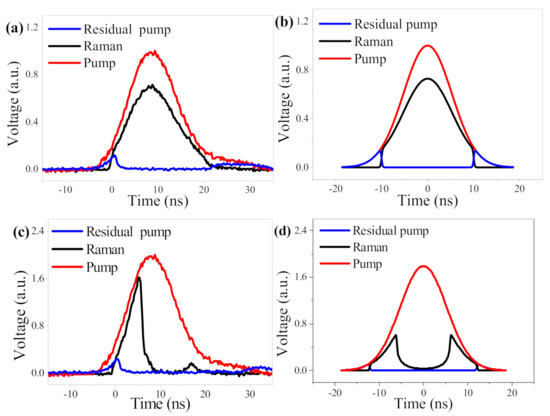 (a,c) Measured pulse shapes of pump light, first-order Raman light, and residual pump light; (b,d) corresponding simulation results [57].