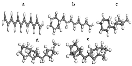 Molecular model of naphthenic mineral oil: (a) Alkanes C12H26; (b) Monocyclic alkanes C14H28; (c) Bicyclic alkanes C13H24; (d) Tricyclic alkanes C16H28; (e) Tetracyclic alkanes C16H26.