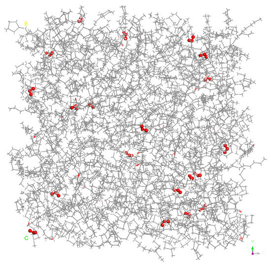 The constant particle number, volume and temperature (NVT) ensemble is used to simulate each system model under a COMPASS force field for 5ps, with a time step of 1fs. The simulation trajectory is output every 250 fs to calculate the dynamic parameters. MD simulation temperature is set to 300 K, 500 K, and 700 K, respectively, to investigate the temperature influence on the displacement and diffusion of water impurities. Especially to compare different concentrations of SA molecules, the simulation temperature of oil-water-acid system was set to 343 K, which is the normal oil temperature of an operating transformer. Taking as an example for an oil-water-acid system, a thermodynamic equilibrium structure with a content of 20 SA molecules at 343 K is shown in Figure 2.