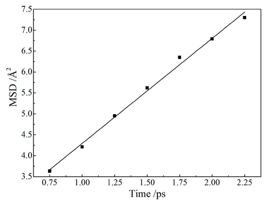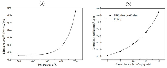 where n is the number of diffusing particles, and the differential can be approximately replaced by the slope a of MSD curves to calculate diffusion coefficient D = a/6. Twenty water molecules in each system model are incorporated for statistic calculations with Equation (2), according to the motion trajectory output from MD processes.