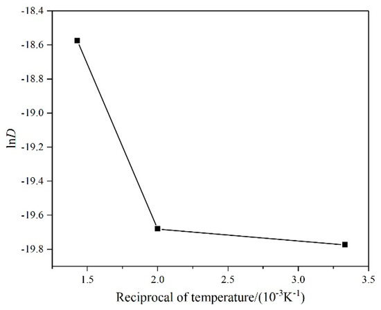 where D0 is the limiting diffusion coefficient, E is the diffusion activation energy, and R = 8.314 J/(mol·K) is the gas constant. The relationship between lnD and the reciprocal of temperature can be obtained with Equation (3) as lnD = −(E/R)(1/T) + lnD0, as shown in Figure 5. The diffusion activation energy can be calculated from the slope of the two straight lines. When the temperature of the oil-water system increases from 300 to 500 K, the diffusion activation energy decreases from 16105.99 J/mol to 579.97 J/mol, which indicates that water molecules in oil are more easily activated and have a stronger diffusion ability at high temperatures.