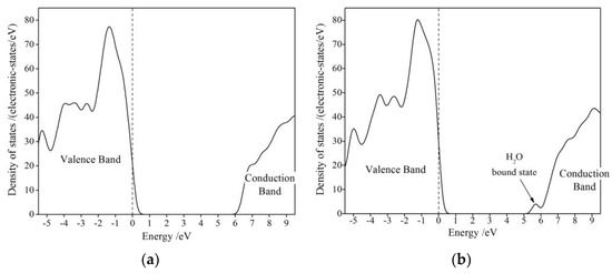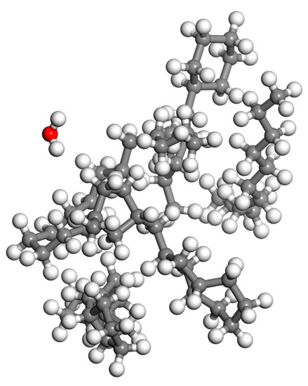 The electron properties of water molecules in the presence of nearby oil molecules are key factors in the electrical breakdown micro-process of transformer oil, and they determine the macroscopic breakdown characteristics of transformer oil containing water impurities. Due to the small amount of water molecules in the oil-water system model, the basic molecules of oil are evenly distributed around a single water molecule, and the contents of several basic alkane molecules are not very different. Therefore, In order to determine the localized electron state introduced by water molecules and the behavior of charge transports in oil, we built a simplified model of an oil-water system containing one water molecule and five basic alkane molecules of naphthenic mineral oil (as shown in Table 1) to feasibly simulate the local region comprising water impurities. After geometry optimization and molecular dynamics simulation, the stable configuration of the simplified model is shown in Figure 6. The densities of states (DOS) of the local area models for pure oil and oil-water systems are calculated by the atom-orbital all-electron first-principles method, as implemented with the DMol3 module of Materials Studio 8.0. Gradient correction functional (GGA) is adopted for DFT exchange-correlation functional, and self-consistent field (SCF) tolerance is set as 1 × 10−6 eV/atom in first-principles calculations. The calculation result of DOS is shown in Figure 7, with the highest occupied state (HOMO) being referenced as energy zero.
