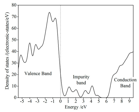 Guan has reported the MD simulation study on the two-phase system of Dodecyl benzene (DDB) insulating oil with water ions, and demonstrated that the collision of water ions with DDB molecules under a high electric field will lead to the fracture of th eC-C bond and the C-H bond in the molecular chain, and produce unsaturated carbon fragments such as CH, CH3, C3H5, and C7H6 [27]. Accordingly, on the basis of the simplified model shown in Figure 6, we added the above unsaturated carbon fragments, one of each type, to build a simplized model of transformer oil with carbonized-fragments that are supposed to be the results of water ions impacting on oil molecules. The first-principles electronic-structure calculations of this carbonized oil model, as shown by DOS in Figure 8, illustrate that a few impurity bands, in a wide energy range from carbonized-fragments, are introduced into the band-gap of the transformer oil, through which electrons are estimated to be thermally excited by kT (k and T denote the Boltzmann constant and the temperature, respectively) from the valence and conduction bands of the transformer oil at ambient temperature.