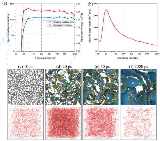 In the first stage (from 10 ps to 20 ps), as the temperature began to rise, the number of carbon rings increased dramatically. We identified the edges of the fragments composed of more than three rings to help to understand how the pores formed. At 10 ps, the start point of the annealing process, the structure was a network of carbon chains. The atomic structure in Figure 1c shows a small amount of separated small fragments of rings. Overall, carbon atoms distributed sparsely and evenly without certain gathering, preventing the probe atom from passing through. So, at this point, there were no open pores, and the accessible surface area was zero. As time goes, carbon atoms gathered to form more rings, and the size of sp2 dominated fragments increased, resulting in the formation of local pores. At 17 ps, several local pores connected to form open pores, and the volume of open pores increased sharply during the following annealing process. Benefit from the increasing open pore volume and edges, the accessible surface area also increased during this stage. As shown in Figure 1d, at the end of this stage, the structure transformed into a network of polyaromatic fragments with abundant edges.