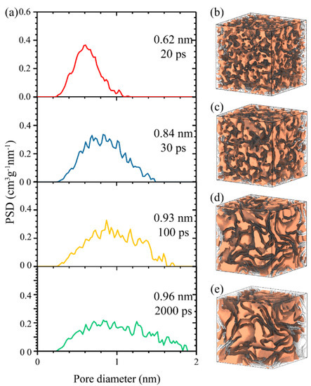 The surface area and pore volume do not include all the information we need about pore structure. The pore size is also one of the main factors influencing adsorption and mass diffusion in the material. In experiments, pore size can be estimated indirectly from experimental isotherms for gas adsorption. From the computational point of view, we can compute the PSD function from the coordinates of carbon atoms. The computed PSD at several annealing times are presented in Figure 2a. We found that the PSD became wider over annealing time. At 20 ps, the maximum diameter was 1.15 nm. It increased to 1.71 nm at 100 ps. The average pore size, calculated from the PSD, also increased dramatically from 20 to 100 ps. From the rendered pore pictures in Figure 2b–d, we observed the formation and growth of pores. At the beginning, the open pores formed through the connecting of initially segregated closed pores during the first stage, and the size was even and small. As the graphene-like framework developed during the second stage, the pore size became bigger, and slit pores were found in the interlayer space of stacked structures. The PSD and rendered pore structure in Figure 2e show little change in the last stage, during which the average pore size changed slightly from 0.93 nm to 0.96 nm. After annealing, there are some free atoms and gaseous triangles, involving about 0.16% of the initial atoms. These atoms were removed from the system. After energy minimization, the average pore size of the final model is 1.09 nm, and the maximum pore size is 2.19 nm. Experimentally, the PSD is calculated from adsorption isotherms. The experimental average pore size of the DGN annealed at 1200 °C is 1.28 nm [46], slightly larger than our results. A minor portion of 2.0–4.0 nm sized mesopores were found in experiments. To describe the minor portion of mesopores in simulations, a much larger system size is needed, which is beyond our computing capability.