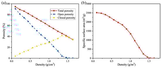 (a) Ratio of porosities as a function of density. (b) Specific surface area declines with increasing density.