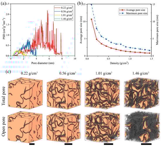 (a) Pore size distribution function at different densities. (b) Average pore size and maximum pore size obtained from the pore size distribution (PSD) as a function of density. (c) Rendered images of total and open pore structures for several densities. The black scale bars represent 5 nm.