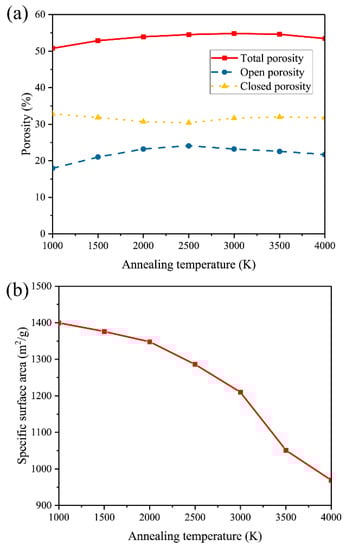 The porosity (a) and specific surface area (b) of disordered graphene networks (DGNs) annealed at different temperatures.