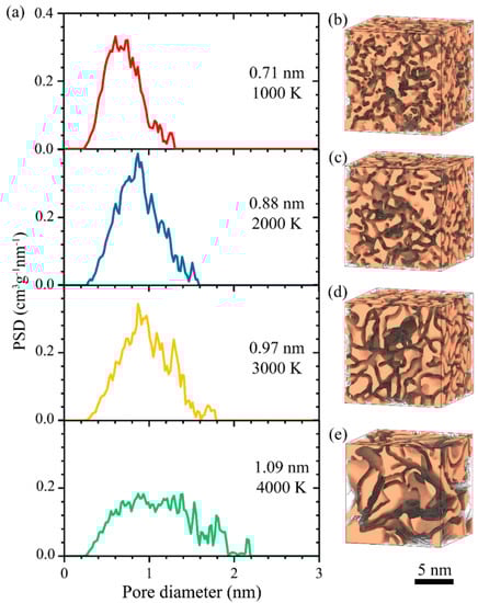 The calculated PSD for DGNs annealed at different temperatures are shown in Figure 6a. When the annealing temperature rises, the distribution of pore size becomes broader. At the same time, the position of the peak, which represents the most accessible pore size, becomes larger. The average pore size is calculated and presented in each panel. It increased from 0.71 nm to 1.09 nm. The increasing pore size can be seen from the rendered images of each DGNs, as is shown in Figure 6b–e. At low temperatures, the pores are uniform, separated by walls of small fragments. While at high temperatures, space is divided by graphene layers, and big slit pores are found. The PSD of our simulations agrees with the experimental results of CDCs [15], where the PSD of ZrC-CDCs shows increasing pore size with the increase of temperature from 600 to 1200 °C. Experimental results suggested that highly graphitized carbon materials adsorbed less hydrogen than less graphitized carbons [24]. Our simulations reveal that smaller pore size results in larger SSA given the same pore volume. Therefore, one can adjust the pore size to achieve better gas adsorption performance by changing the annealing temperature during material processing.