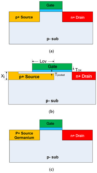 The cross-sectional views of the point TFET, line TFET and Ge-source TFET used in this work are shown in Figure 2. The parameters are as follows: effective oxide thickness Tox = 1 nm, depth of the junction Xj = 30 nm, thickness of the pocket between the gate oxide and the source Tpocket = 3 nm, lengths of the drain and channel equal to 100 nm, length of gate–source overlap Lov = 80 nm, gate metal work function ϕ = 5 eV, p+ source doping NS = 1 × 1020 cm−3 (Ge-source TFET: NS = 1 × 1019 cm−3), n+ drain doping ND = 1 × 1020 cm−3 (Ge-source TFET: ND = 1 × 1019 cm−3) and p- substrate doping PSub = 1 × 1017 cm−3.