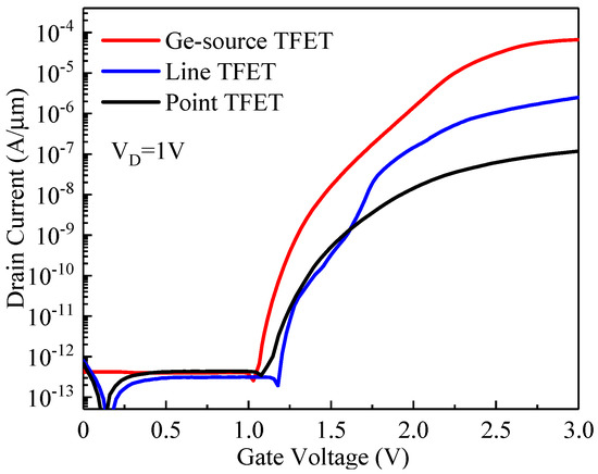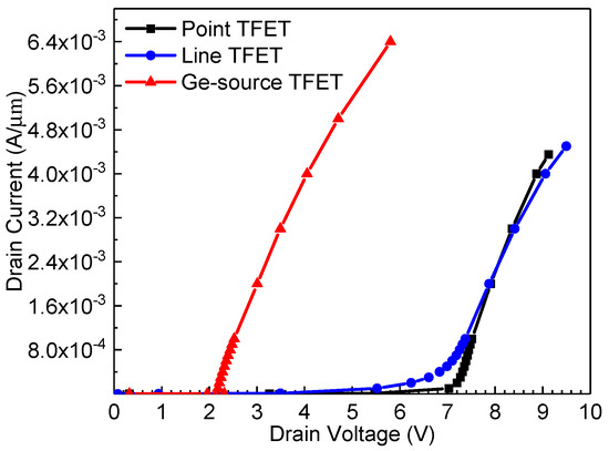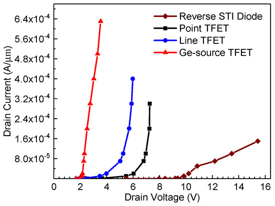 As mentioned in [12,13], the TFETs subjected to an ESD stress have a BTBT-assisted avalanche generation mechanism. However, as the BTBT current of the point TFET is not high enough, the reduction in trigger voltage is still not satisfactory. Therefore, optimization of the TFET structure to increase the BTBT current can reduce the trigger voltage. Generally, the line TFET has a larger BTBT current than the point TFET because the tunneling area can be increased easily by enlarging the length of the gate–source overlap region (Lov) [16]. Using the germanium material in the source region can further increase the TFET’s current because the material has a narrower band gap and lower carrier effective mass than silicon and, consequently, the BTBT generation rate is increased [15,17]. Simulated transfer curves of the three types of TFETs are shown in Figure 3, where it can be observed that the Ge-source TFET has a significantly higher BTBT current under the same bias condition with a comparable device size.