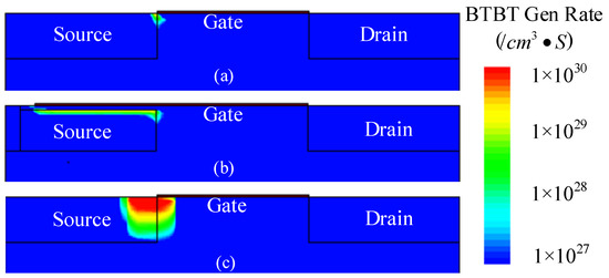 The gates of TFETs can be connected to their own drains or sources. In this work, the gates are connected to the drains, and, in turn, the BTBT and avalanche generation both occur in proximity to the source/channel interface. Note that since a proper gate metal work function was used, the leakage currents under the normal operating condition (VG = VD = 1 V) are low enough, as shown in Figure 3.