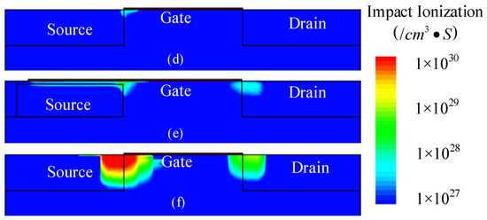 Band-to-band tunneling generation rates of (a) point TFET, (b) line TFET and (c) Ge-source TFET, and impact ionization rates of (d) point TFET, (e) line TFET and (f) Ge-source TFET at a voltage pulse of 3 V.