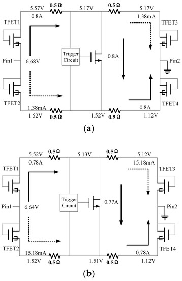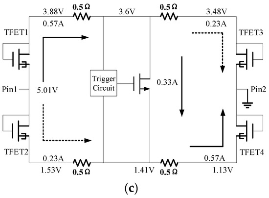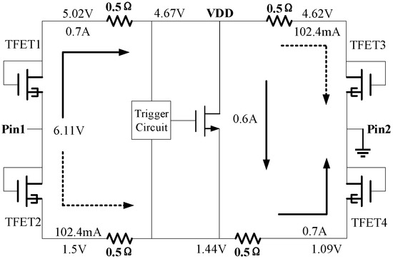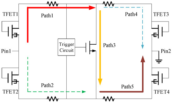 In the whole-chip ESD protection, the pin-to-pin protection has the longest path and, therefore, the lowest robustness. The TFET is introduced to enhance the robustness, as shown in Figure 7. When the ESD current flows from pin1 to pin2, three discharge paths exist, i.e., the primary path path1-path3-path5 (Pp), the secondary path path2-path5 (Ps1) and path1-path4 (Ps2). Since TFET1 and TFET4 operate as positive biased p-n diodes, Pp has a relatively low conduction voltage and is the primary path. On the other hand, Ps1 and Ps2 with relatively high conduction voltages form the secondary paths. In the simulations, the TFETs and MOSFET have widths of 200 and 600 μm, respectively.