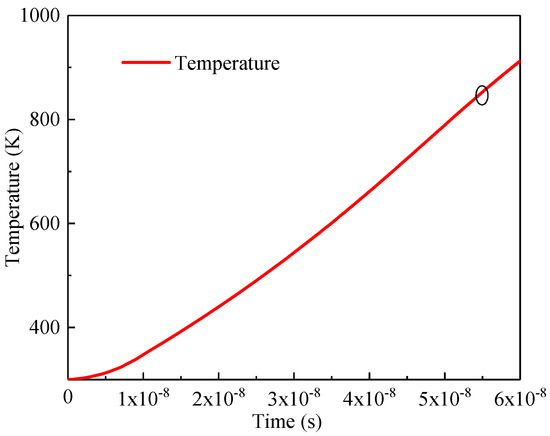 A TLP current having an amplitude of 0.8 A is applied to the whole-chip protection networks with three different TFETs. Figure 8 shows the node voltage and path current at 20 ns. It can be observed that the clamping voltage is 5.01 V for the Ge-source TFET-based protection network, whereas the voltages are 6.64 and 6.68 V for the line and point TFET counterparts, respectively. This difference is due to a higher conduction of the current (0.23 A) by the Ge-source TFET compared to the line TFET (15.18 mA) and point TFET (1.38 mA). The point and line TFET-based protection networks pass the 0.8 A TLP test. The corresponding maximal temperatures are 1090 and 1066 K, respectively, which are lower than the default silicon failure temperature of 1200 K. On the contrary, the Ge-source TFET fails because the maximal temperature in the TFET reaches the default Ge failure temperature of 890 K at 55 ns, as shown in Figure 9. In fact, the failure current of the Ge-source TFET-based protection network is only 0.5 A.