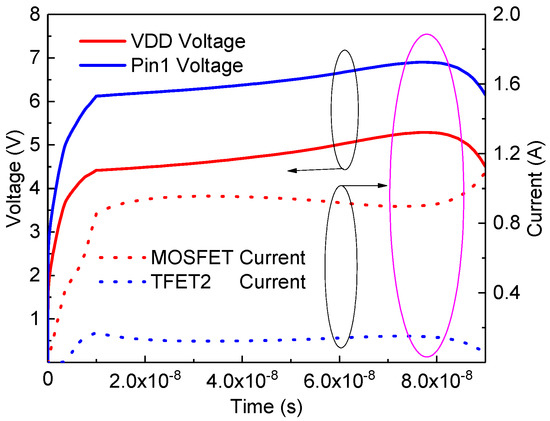 Figure 10 shows the node voltage and path current of the SiGe-source TFET-based ESD protection network under a 0.8 A current TLP simulation, in which the Ge mole fraction was set to 0.5. It can be noted that the clamping voltage increases from 5.01 to 6.11 V compared to the pure Ge-source TFET. However, this voltage is still lower than those in the point and line TFETs. As the SiGe-source TFETs conduct proper currents, the protection network does not fail even under a 1.1 A TLP simulation. The TFET and MOSFET maximal temperatures are 699 and 1150 K, respectively. Figure 11 shows the node voltage and path current under a 1.2 A TLP simulation. It can be observed that the Pin1 voltage starts to decrease and the current flowing through the MOSFET starts to increase at around 80 ns, indicating that thermal breakdown occurs in the MOSFET rather than the TFETs. A comparison of the four protection networks is shown in Table 1.