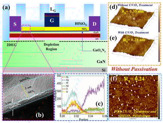 - Li, S.; Hu, Q.; Wang, X.; Li, T.; Li, X.; Wu, Y. Improved interface properties and dielectric breakdown in recessed AlGaN/GaN MOS-HEMTs using HfSiOX as gate dielectric. IEEE Electron. Device Lett. 2019, 40, 295–298. [Google Scholar] [CrossRef]