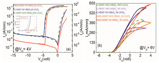 | Parameters | C-HEMT | C-HEMT with UV/O3 | C-HEMT with UV/O3 and HfSiOX | MOS-HEMT with UV/O3 | MOS-HEMT with UV/O3 and HfSiOX |