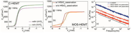 - Mazumder, S.; Wang, Y.H. Investigation of HfSiOX passivation effect on AlGaN/GaN HEMT. In Proceedings of the 2020 International Symposium on Devices, Circuits and Systems, ISDCS, Howrah, India, 4–6 March 2020; pp. 1–4. [Google Scholar]
