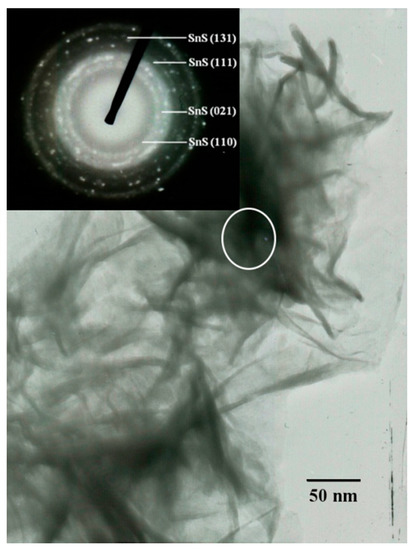 Transmission electron microscope (TEM) image and selected-area electron diffraction (SAED) pattern of the SnS structure of the as prepared 10SnS/AG sample. In all prepared nanocomposites, the SnS particles had this microstructure.