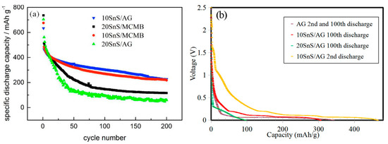 Figure 4a presents the capacity of all samples when cycled against Li for 200 cycles. It is seen that in all cases the capacity faded continuously with cycling. The lower SnS content electrodes (10SnS/AG and 10SnS/MCMB) had an initial capacity of ~630 mAh g−1 that reduced to ~260 mAh g−1 after 120 cycles. This is approximately the capacity of the carbon bases (AG and MCMB) used to support the SnS. The higher SnS content samples (20SnS/AG and 20SnS/MCMB) showed a higher initial capacity of over 700 mAh g−1, but a greater capacity decrease during cycling, which reached 100 mAh g−1 after 120 cycles.