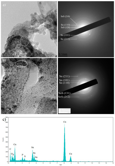 Comparing Figure 6 with the initial microstructure depicted in Figure 2 reveals that after cycling, the flower-like structure of the SnS particles was “destroyed”. The initial SnS nanofibers decomposed into nanoparticles that were 2–10 nm. Similarly, as the XRD indicated, the SAED patterns in Figure 6 documented the existence of pure Sn and SnS phases; however, no C rings were observed, even though the area considered contained a lighter phase region. This indicated that the light contrast region surrounding the nanoparticles (in Figure 6) was not the initial carbon particle substrate, but solid electrolyte interface (SEI) or electrolyte residue. This is verified by the representative EDS spectrum in Figure 6c that illustrates that the light shaded area of Figure 6a contained high contents of F, O, C, and P. This C would be from the binder and carbon additive of the electrode.