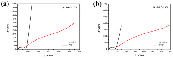 Electron impedance spectroscopy (EIS) diagrams for (a) 10SnS/AG and (b) 20SnS/AG, before and after 20 cycles.