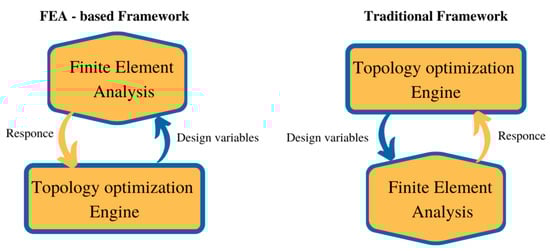 A finite element analysis (FEA) controlled framework was used in this work, which is more efficient while comparing with traditional optimization engines [41]. In the traditional framework, the topology optimization engine required FEA, but FEA requires topology optimization in an FEA-based engine. The comparison of those two frameworks is illustrated in Figure 1. FEA-based engine pre-calculates the required data for the optimization; hence the repetitive process is avoided, which speeds up the process.