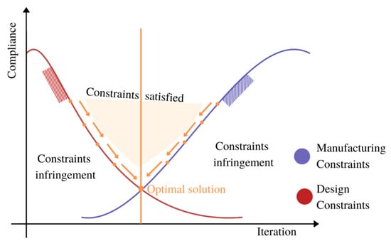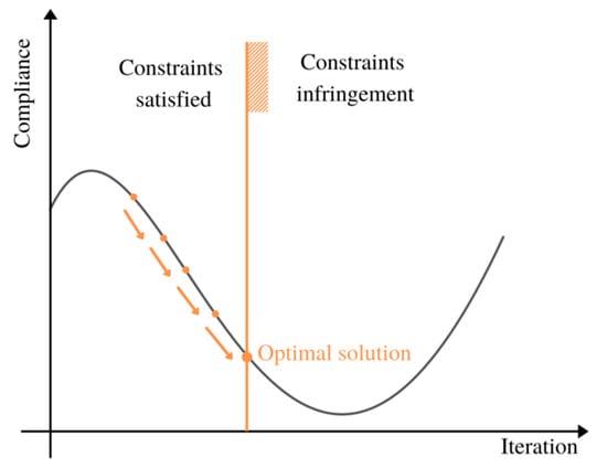 An FEA-based frameworks optimization engine decides to solve the problem either using the optimality criteria method (OCM) or moving method asymptotes (MMA) depending upon the number of constraints. The engine’s main objective, to get minimum compliance in the number of iterations is illustrated in Figure 2. The aim is to determine the optimal solution with less compliance without constraints infringement. The OCM quickly and effectively handles the single constraints optimization problem, which scales up and works fast while compared with MMA. In OCM the required information for the optimization engine is pre-stored. Hence there is no need to depend on the information from past iterations.