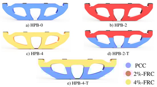Fiber dosage layout in TOHPB (a) HPB-0 (b) HPB-2 (c) HPB-4 (d) HPB-2-T and (e) HPB-4-T.
