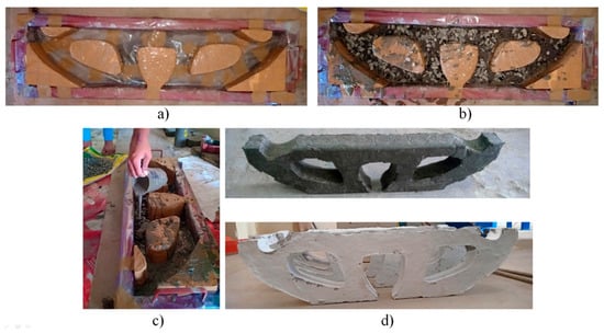 First, the 910 × 230 × 76 mm3 rectangular steel framework was prepared and kept ready for the casting process. Solid wooden blocks were cut according to the shape of the TOHPB and then placed into the empty framework to obtain the shape of HPB. The coarse aggregates were pre-soaked before casting to avoid more water absorption and to alleviates the grouts’ ultimate ratio of W/B. Figure 9 illustrates the casting process of HPB comprising two primary approaches; first, the coarse aggregate and fiber were prepacked into the designed formwork. Second, the gaps between the aggregate and fiber were filled with cement grout. The casting process was completed in two-layer. A light vibration was applied to prevent honeycombing and ensuring high compactness. Furthermore, cubes of 100 mm were cast to assess the compression strength of nonfibrous and fibrous concrete.