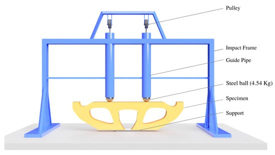 According to the ACI committee, 544 [45], a repeated impact test was carried using two numbers of steel balls with a weight of 4.54 kg. The steel ball was dropped freely using a pulley from a height of 457 mm inside a guide pipe to ensure the replicated impacts, which targeted the upper side of the specimen with one-third of the span from both ends as indicated in Figure 10. The specimen was supported over a steel plate with the L/6 of the beam span. The repeated impacts were counted, and the initial crack (IC) was noted for further studies. Impacts were repeated up to failure (FA) occurrence. The naked eye could visualize the initial crack propagation and final failure occurrence. The impact energy was calculated using Equation (1)