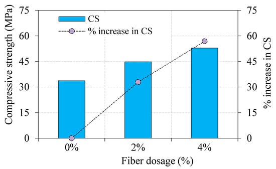 The observed compressive strength of PAFC specimens by incorporating 2 and 4% dosage of fibers at the age of 28 days is illustrated in Figure 11. The results indicated an increasing trend in compressive strength with increasing the fiber dosage from 2 to 4%. It can be noted prudently from Figure 11 that an increased compressive strength was observed in specimens comprising 2 and 4% of fibers reinforcement. These values were increased by about 45 and 57%, respectively, compared to the nonfibrous specimen. Normally, the limitation of fiber dosage in traditional fibrous concrete is 2% due to workability problems, maintaining an even fiber distribution. According to the earlier studies, a dosage of more than 2% of fiber leads to conglobate, more weak spots, quick crack formation, and reduced strength. Nehdi et al. [27] reported that superior compressive strength could be attained in PAC when the dosage of steel fiber is up to 6%. The improved compressive strength is due to higher fiber content, which causes improved crack resistance and growth.