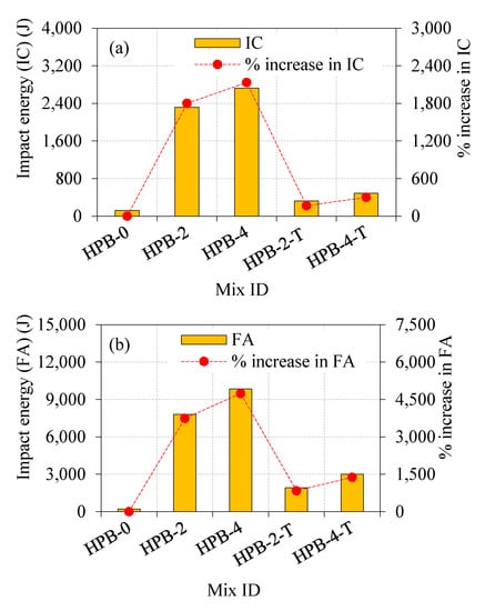 It is observed in Figure 12 that impact energy was increased at fully fibered concrete HPB-2 and HPB-4 than the nonfibrous concrete HPB-0. The addition of fiber increased the impact energy absorption and delayed the crack initiation [46]. The steel fibers significantly contributed to arresting crack propagation in the meantime, transmitting the energy effectively [47,48,49,50,51,52,53,54,55,56,57,58,59,60,61,62,63,64,65,66]. Fully fibered concrete HPB-2 and HPB-4 were 2318.4 J and 2725.1 J, respectively, had impact energy at the initial crack while compared with the Tension zone fibered concrete HPB-2-T and HPB-4-T were 325.4 J and 488.1 J, respectively. The same trend is followed in the impact energy during failure. The fully fibered concrete beam HPB-2 and HPB-4 were 7809.2 J and 9842.9 J, respectively having high impact energy at failure while in comparison to tension zone fibered concrete HPB-2-T and HPB-4-T were 1911.6 J and 3009.8 J, respectively.