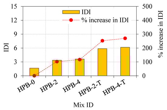 Figure 13 illustrates the impact ductility index of all tested HPB. The ratio of impact energy at the failure to the impact energy at the first crack is defined as IDI. The beam (HPB-4-T) reinforced only in the tension zone at 4% dosage exhibited the higher IDI value (6.2). This indicated the higher post-crack resistance and ductility of the HPB against impact loading. The next best IDI value observed from the (HPB-2-T) beam and the corresponding value was 6.2. Moreover, the IDI value for the HPB-2 and HPB-4 were 3.4 and 3.9, respectively. It is clear from the above discussions, the beam reinforced only in the tension zone exhibited excellent post-crack resistance than the beam reinforced with full cross-section. This phenomenon was due to fibers blocking the formation of micro-cracks. During the macro crack formation, fibers limited the crack propagation by closing the crack tip’s opening inside the concrete; thus, brittle breakability was repulsed and postponing the crack growth resulting in ductile behavior.