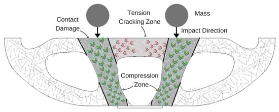 As this research is a continuation of work reported by Salaimanimagudam et al. [22], the local compressive damage was spotted at the contact point of impact. From the beam’s top chord, the impact energy wave was transmitted by compression web to the bottom chord. The tension zone occurred at the mid of the top chord, which was subjected to dual impacts resulting in the stress wave crashing at the top chord between two compression webs. In the tension zone, there may be an air crack, shear plugin fibers may be local or global even fiber delimitation occurs in the worst cases with and the fiber rupturing; matrix failure may happen at the web and bottom chord. The numerous wave sway of impact energy in each particular step is delineated in Figure 14 [22]. This holds restricted local contact crushing due to the subjection of impact mass. The compression bending over an impact plane causes innermost deboning of beams due to the transverse shear stress/strain, break- down of matrix/fiber triggered. In the meantime, the tensile bending triggers the fiber deboning action, which spreads over an adjunct stratum of the tension zone. The stress wave generated by the drop weight impact is transmitted to densely packed fibers and aggregates skeleton, which leads to numerous micro-cracks formation.