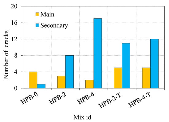 The number of main and secondary cracks is illustrated in Figure 15. In a nonfibrous concrete beam, HPB-0 having three main cracks at the top chord and one main and secondary crack at the bottom chord. Three main cracks were observed in the top chord of the specimen HPB-2 with eight secondary cracks. HPB-4 had a comparatively smaller main crack and many secondary cracks, two main cracks in the top chord, and seventeen secondary cracks throughout the beam. For HPB-2-T and HPB-4-T, both beams had the same 5 number of main cracks at the bottom chord and eleven and twelve secondary cracks.