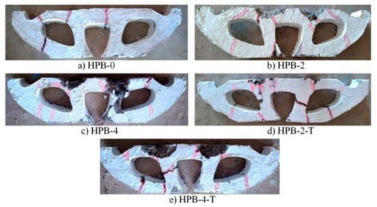 Moreover, the new type of horizontal flexural cracks can be observed in the compressive web in Figure 12d. The major local compressive crush can be visible HPB-4-T in Figure 16. The number of main cracks evidences the brittleness of plain concrete in the compressive zone. The compressive web failed due to fibers’ addition only in the tension zone, and the same tendency of failure mechanism can be observed in HPB-2-T and HPB-4-T.