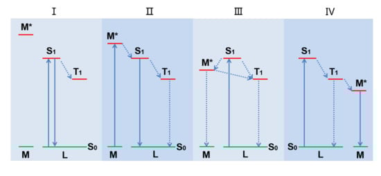 The emission nature of metal-organic complexes depends strongly on the relative energy level of the lowest excited state of metal atom(s) and organic-ligand(s). As shown in Figure 1, according to the relative position of the energy levels between metal ion excited state (M*) and the lowest excited singlet state (S1) and lowest excited triplet state (T1) of the organic ligand, there are four excited state charge transfer modes.