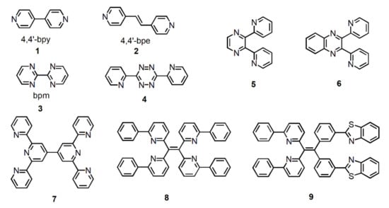 With the development of research on emissive metal complexes, small molecule bridging ligands have been unable to meet the study requirements. Therefore, a large number of functionalized large polypyridine organic ligands have been designed and synthesized for the preparation of NIR emissive metal complexes [33,36,37,38]. As shown in Figure 2, from 4 to 9, not only the relative molecular weight of bridging ligand distinctly increases, but also their structure with special functions gradually becomes complicated. Whereas, it should be noted that the design principle of these molecules is consistent, i.e., combining bipyridine-like units and metal ions to form NIR emissive metal complexes.