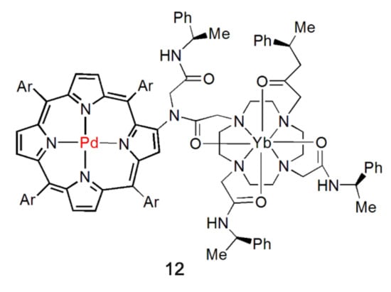 Thereupon, the strategy of modifying the group with coordination sites on the periphery of the porphyrin core as a bridging ligand for the synthesis of NIR light-emitting complexes has been proposed. The advantage of this system is that the energy level of the excited state of the chromophore can be fine-tuned by the combination of metal cations with the tetraaza nucleus of the porphyrin. Furthermore, by increasing or decreasing the distance between the porphyrin core and peripheral coordination atoms, i.e., controlling antenna ligand length, NIR luminescence properties can be tuned. In 2000, Beeby et al. first realized this strategy [40]. They synthesized a palladium porphyrin with a chiral cyclization group, which was covalently linked to the porphyrin backbone via the β-pyrrole position (Figure 4). The excitation of porphyrin at 529 nm caused the emission at 980 nm for the Yb complex and 870 nm and 1064 nm for the Nd complex. The phosphorescence of Pd porphyrin was observed in both cases. Since then, this type of ligand has been designed and synthesized purposefully by the researcher and applied to the study of NIR light-emitting metal complexes.