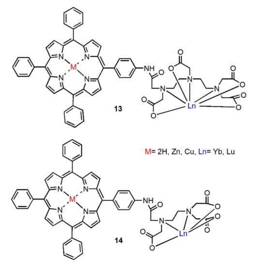 Rusakova et al. reported the polydentate ligands by coupling mono-4-aminotetraphenylporphyrin with the anhydride of the ethylenediaminetetraacetic acid (EDTA) or the diethylenetriaminepentaacetic acid (DTPA) and constructed NIR radiative metal complexes in 2010 [41]. These ligands have been obtained by covalently binding porphyrin core with penta- or hepta-dentate ligands. As shown in Figure 5, the corresponding photophysical properties of Yb complexes and other metal complexes (Zn and Cu) were studied. The results showed that energy was transferred from porphyrin antenna to Yb ion. Due to the good shielding effect of the emitter, the near-infrared radiation of heptadentate ligand was slightly enhanced. However, the existence of Cu or Zn ions in the porphyrin cavity led to the quenching of the NIR emission.
