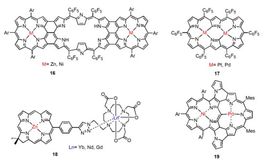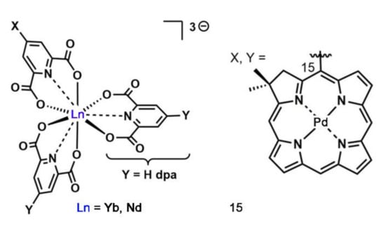 In 2018, Xiong et al. synthesized a series of metal complexes by using porphyrin derivative as organic bridging ligands [42]. As shown in Figure 6, the free base and Pd chelate chlorins were appended to the 4-position of the dipicolinic acid through either the 3- or the 15-position of the chlorin to form bridging ligands. The excitation of porphyrin derivatives at 590 nm induced the emission at 980 nm for the Yb complex and 890 nm and 1064 nm for the Nd complex. In this report, the combination of narrow Ln emissions with narrow chlorin absorptions provides avenues for excitation and emission-based multiplex imaging.