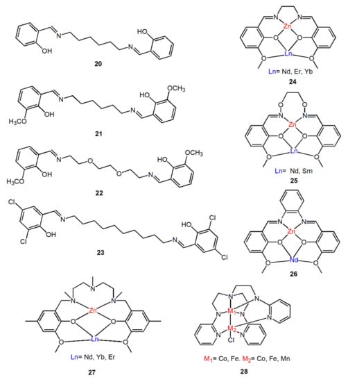 Salen-type Schiff base is a kind of commonly used organic ligand, which is chelating ligand formed by the condensation of two identical salicylaldehyde molecules and a diamine molecule. There are 4 atoms of O, N, N, and O in the center, which can be used as ligand units of some metal ions to form M-salen complexes (M = Ti, Zr, Fe, Mn, Co, Zn, etc.). Interestingly, 3-Methoxysalicylaldehyde react with different diamine derivatives can generate an additional coordination cavity for coordinating with other metal ions (usually lanthanides) to form dinuclear complexes, which are usually used to study the luminescence properties of 3d-4f heterometallic Schiff base complexes [52,53,54,55]. For example, complexes 24–26 in Figure 8 all exhibit excellent luminescence performance in the NIR region. Inspired by salen-type Schiff base, some ligands that mimic the coordination pattern of salen-type Schiff bases were synthesized. Refs. [56,57], such as complexes 27 and 28, they have the same coordination mode as salen-type Schiff base. These metal complexes with these synthesized bridging ligands also show good near-infrared luminescence properties.
