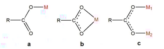 The coordination pattern of carboxyl group: (a) Monodentate coordination; (b) chelation coordination; (c) bridge coordination.